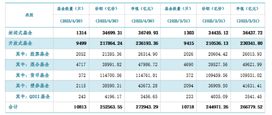 最后我们再来看看中国公募基金的最新情况。来自中国证券投资基金业协会的数据显示,截至2023年4月底,我国境内共有基金管理公司143家,其中,外商投资基金管理公司47家(包括中外合资和外商独资),内资基金管理公司96家;取得公募基金管理资格的证券公司或证券公司资产管理子公司12家、保险资产管理公司1家。以上机构管理的公募基金资产净值合计27.29万亿元。时隔两个月,我国公募基金规模再站上27万亿元。