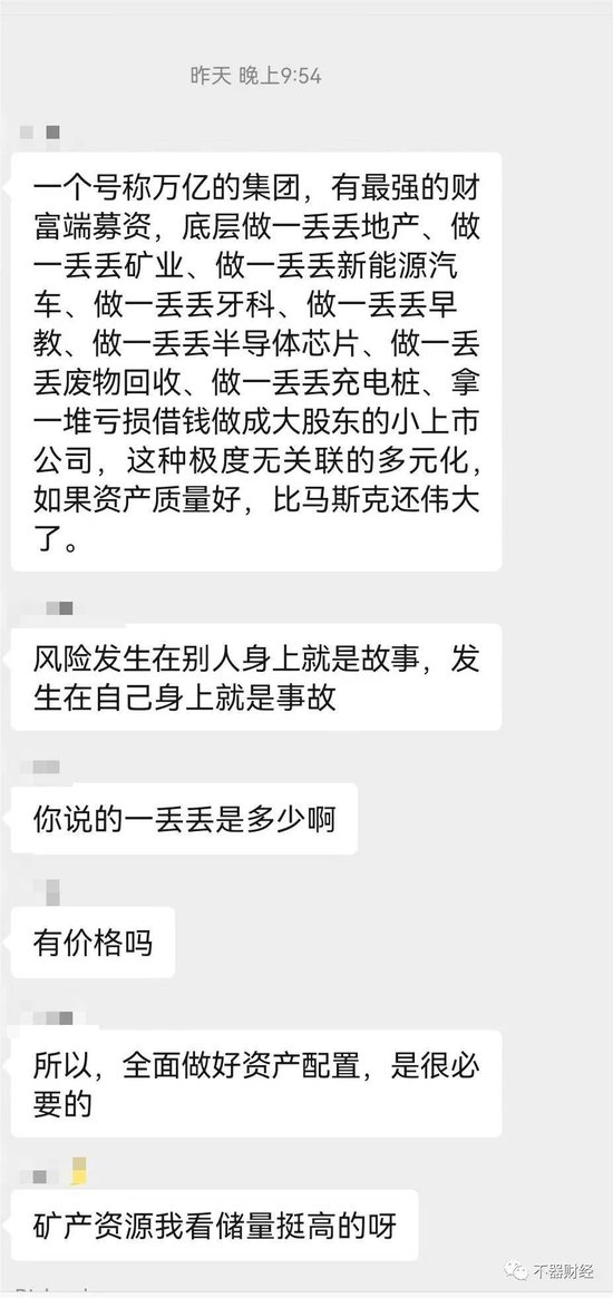 他表示:“一个号称万亿的集团,有最强的财富端募资,底层做一丢丢地产、做一丢丢矿业、做一丢丢新能源汽车、做一丢丢牙科、做一丢丢早教、做一丢丢半导体芯片、做一丢丢废物回收、做一丢丢充电桩、拿一堆亏损借钱做成大股东的小上市公司,这种极度无关联的多元化,如果资产质量好,比马斯克还伟大了”。