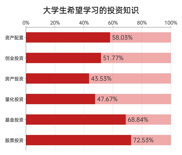 调查结果则显示:大学生更倾向于学习股票投资、基金投资知识,此外超半数同学希望学习创业投资、资产配置知识,而希望学习量化投资、房产投资的同学占比也超四成;38.14%的大学生希望通过模拟盘操作学习投资,希望通过线下专题讲座及课程和线上课程(预录制视频)开展学习的同学分别占21.29%与15.45%。