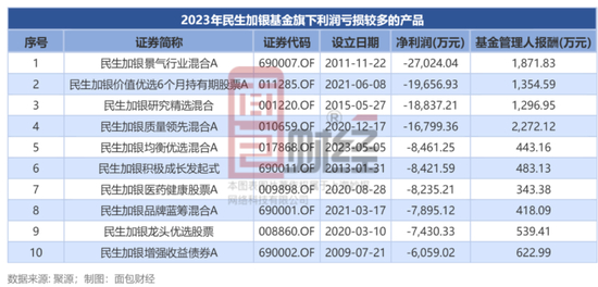 但亏损扩大的同时,民生加银也收取不菲的管理费。2023年财报数据显示,民生加银基金旗下产品贡献管理费超过6亿元。部分产品去年亏损金额较大。