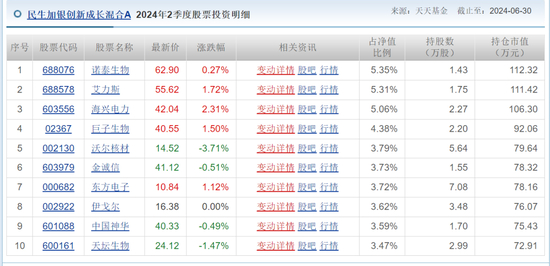 再来看2024年二季度民生加银创新成长的前十大重仓股票,又变成了医药为主,混搭能源、电网设备、新材料、煤矿的配置。相较上一季度,其前十大重仓股除了诺泰生物,几乎又全部“换血”。