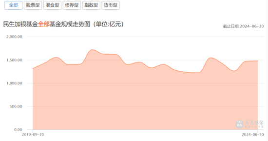 数据显示,早在2017年三季度末,民生加银基金的规模就达到1064.24亿元,就跻身千亿元梯队。2020年底时,民生加银基金资管最高达1720.89亿。但到了2024年二季度,民生加银基金的最新管理规模为1479.50亿元,排在行业43名。