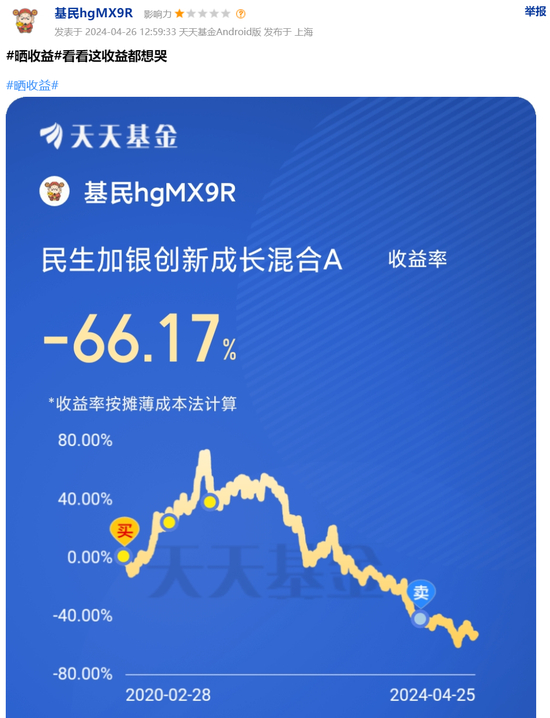 可不是让人想哭嘛。从该基民晒出的收益图显示,其建仓之初收益还是稳步上涨的,最高的时候一度接近80%。但从2022年开始,收益率便开始持续走下坡路,不仅由正转负,到2024年4月25日时,收益率已经跌到了-66.17%。