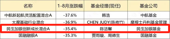 事实上,不止是陈洁馨,近年来,民生加银基金中,不少基金经理业绩拉胯。就连刘霄汉、孙伟等“行业老将”,业绩都略显尴尬。