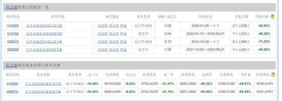 加入民生加银以来,陈洁馨共管理过两只基金,民生加银创新成长混合A/C,和民生加银医药健康股票A/C。但其任期内,这两只基金产品的表现都不佳。比如民生加银创新成长混合A,截至8月16日,陈洁馨任期回报竟然为-73.35%;民生加银医药健康股票A任期内也亏了49.26%。