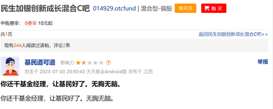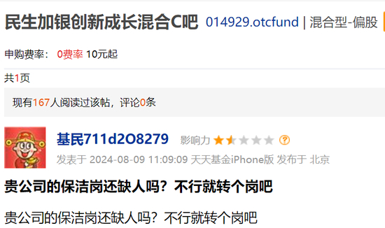 看着基金账户不断亏损的数字,基民们早就破防,在股吧中表达自己的不满和愤怒。有基民气到在股吧里吐槽,“你这还干基金经理,让基民好了”“贵公司的保洁岗还缺人吗?不行就转个岗吧”。