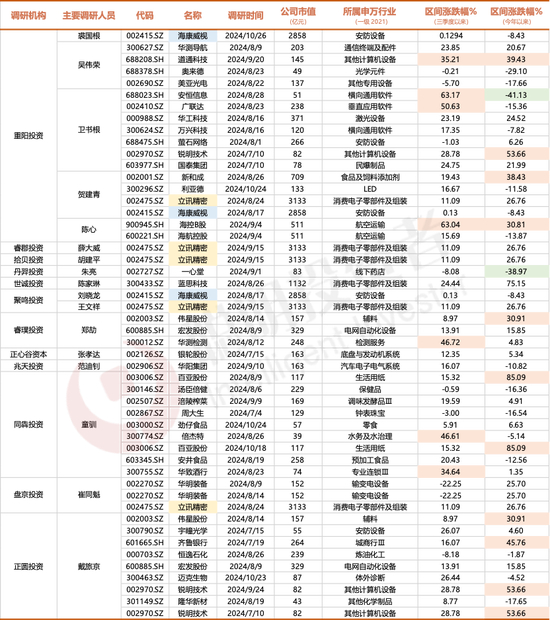 比如10月26日海康威视的调研中,重阳裘国根罕见露面。更早些8月17日的海康威视调研中,聚鸣刘晓龙也曾露面。