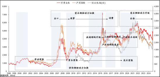 这里把历史上的这些牛市,跟当时经济结构上出现的显著变化都标注出来了。