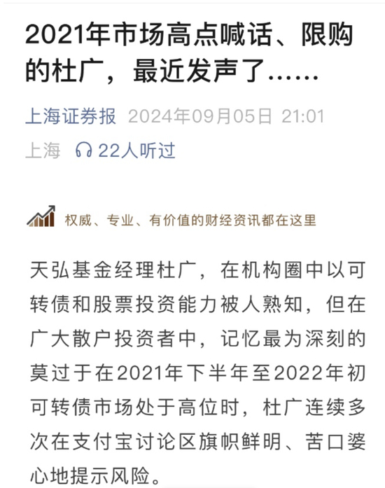 杜广:转债层面,我们在最底部的时候曾跟投资者去沟通过,我们抄底了被市场抛弃的深度低价的转债。