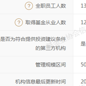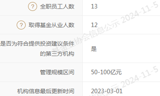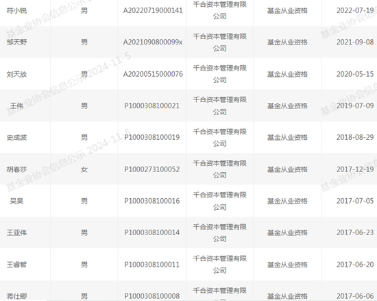官方备案资料显示:截至2024年11月5日,千合资本的全职员工人数为13人,其中12人已取得基金从业资格。