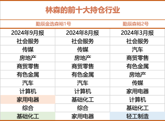 勤辰金选森裕1号截至9月底时的前五大持仓行业(申万一级)分别是:社会服务、传媒、房地产、商贸零售和有色金属,合计占据56%左右的比例。