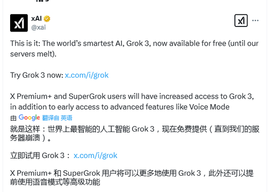 马斯克旗下xAI:Grok 3将免费开放直到服务器崩了为止