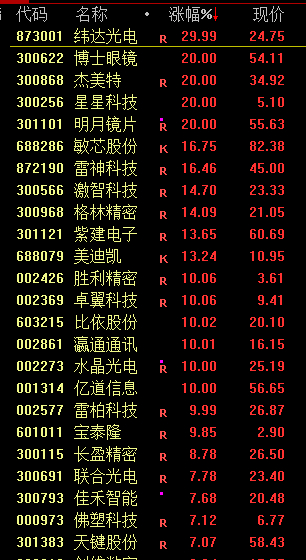 AI眼镜概念股集体爆发,明月镜片、杰美特、博士眼镜、星星科技、水晶光电、瀛通通讯等多股涨停。