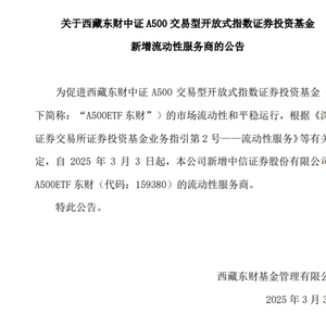 日前,西藏东财基金管理有限公司(简称:东财基金)发布公告称:为促进西藏东财中证A500 交易型开放式指数证券投资基金(简称:A500ETF东财)市场流动性和平稳运行,自2025年3月3日起新增中信证券为流动性服务商。