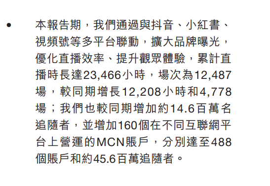 根据九方智投控股2024年中报显示,截至2024年6月,公司共有488个在不同互联网平台上营运的MCN账户,拥有约4560万名追随者,累计直播1.2万场、超2.3万小时,“我们通过与抖音、小红书、视频号等多平台联动,扩大品牌曝光优化直播效率、提升众体验”。根据资料显示,截至2022年12月,公司在多个互联网平台上拥有245个MCN账户,总追随者超过3600万名。换而言之,九方智投控股用18个月时间,使得其MCN账户翻了一番,追随者数量增长了近千万。