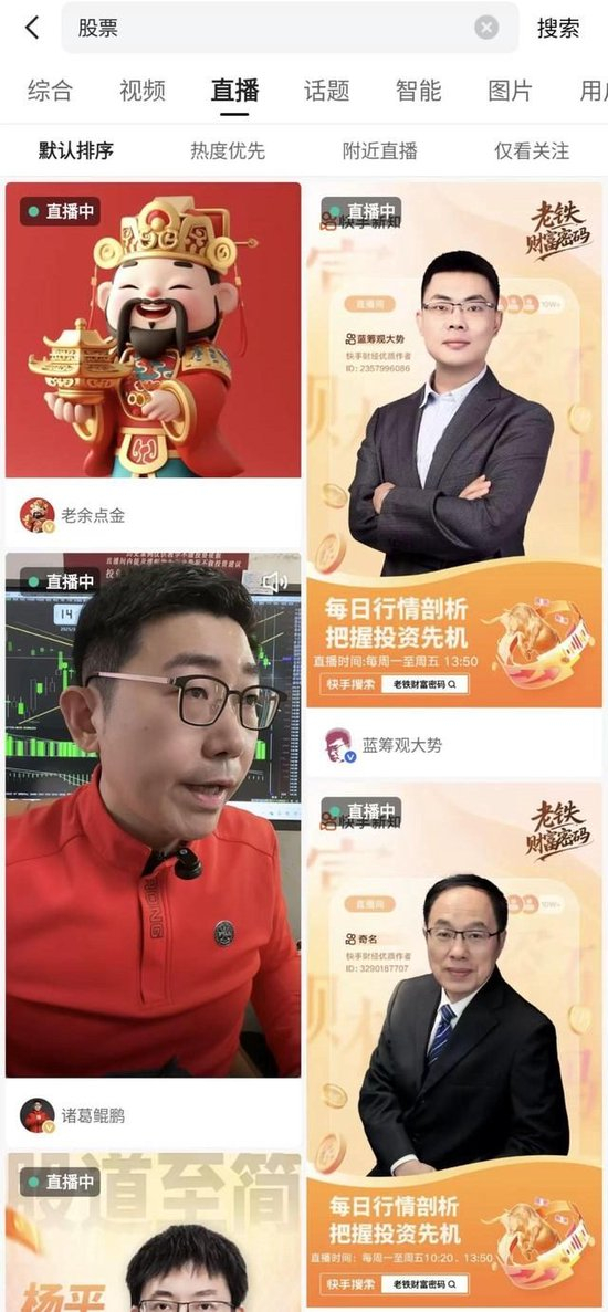 在快手APP上搜索“股票”关键词,出现的直播账号。