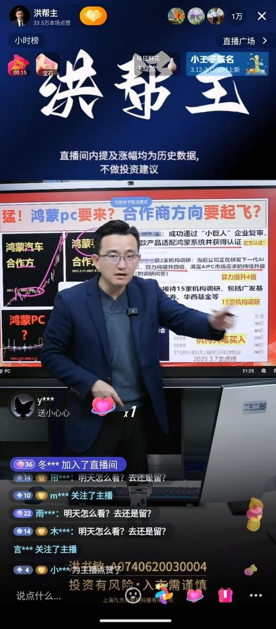 3月12日,九方智投首席投资顾问洪书敏在抖音平台上直播。