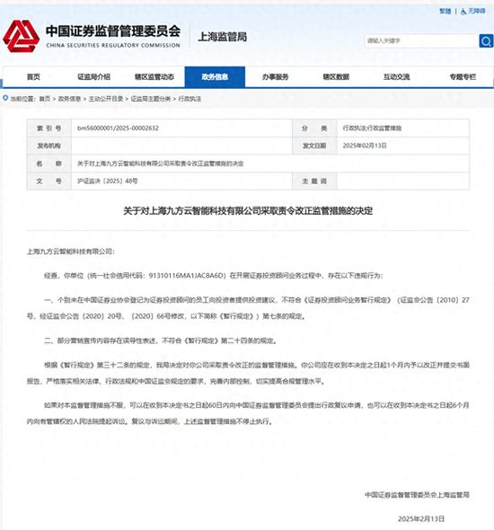 在4张罚单中,最值得关注的是一张针对国内老牌知名投顾机构——上海九方云智能科技有限公司(以下简称为“上海九方云”)的罚单。经查,上海九方云在开展证券投资顾问业务过程中,存在个别未在中国证券业协会登记为证券投资顾问的员工向投资者提供投资建议、部分营销宣传内容存在误导性表述等情况。因此,公司被上海监管局采取责令改正的监督管理措施。