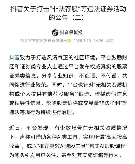 实际上,抖音近期对非法荐股的打击,也是集中在AI概念包装下的违法违规行为上。3月10日,抖音发布关于打击非法荐股等违法证券活动的公告称,平台近期发现,有少数账号在无相关资质情况下,声称可借助各种AI类工具实现所谓“高回报高收益”,或以“推荐高效AI选股工具”“售卖AI炒股课程”为噱头引发用户关注,甚至对其实施诈骗等行为。