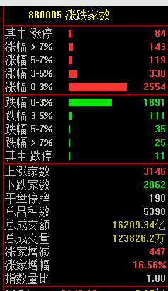 市场共3146只个股上涨,84只个股涨停,2062只个股下跌。