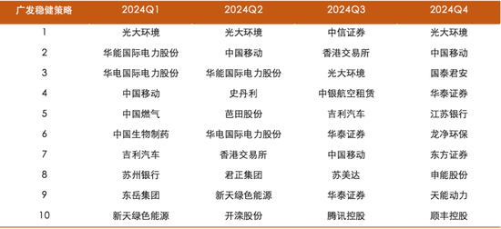 下图为广发稳健策略近四个季度前十大重仓: