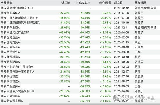 业绩方面更是一地鸡毛:今年以来、近一年、近三年,全线为负。近三年平均跌幅超过44.49%。