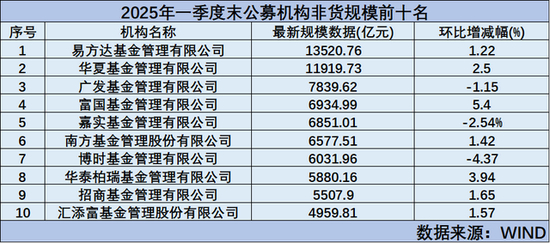 根据WIND统计,截至2025年一季度末,非货规模前十名依次为:易方达基金、华夏基金、广发基金、富国基金、嘉实基金、南方基金、博时基金、华泰柏瑞、招商基金、汇添富基金。
