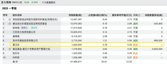 苏大维格披露的2025年一季报显示,葛卫东以个人名义首次现身该股股东名单,在今年一季度新买进162万股,期末参考市值为3300万元,位列第七大流通股东。傅鹏博、朱璘管理的睿远成长价值混合基金在一季度减持苏大维格24.28万股,持股数降至1267.54万股,期末持有市值为2.56亿元,仍位列第二大流通股东。