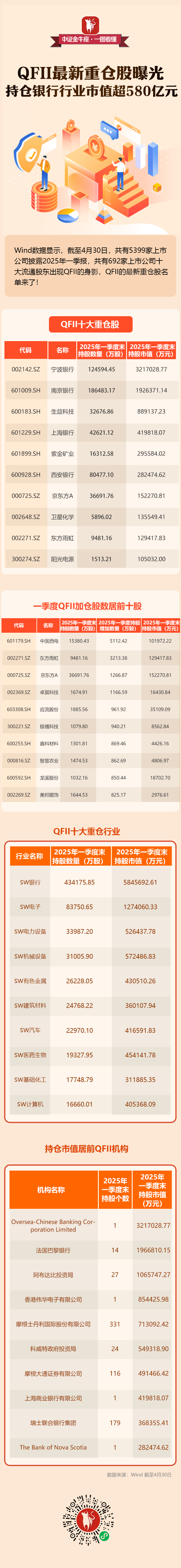 【一图看懂】QFII最新重仓股曝光,持仓银行行业市值超580亿元