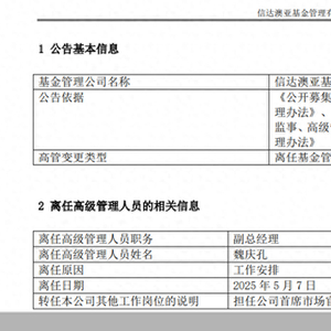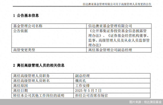 5月8日,信达澳亚基金发布公告表示,副总经理魏庆孔因工作安排原因离任,转任公司首席市场官。