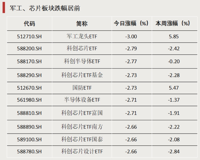 前两日大涨的军工龙头ETF(512710)、国防ETF(512670)等今日显著回调,分别下跌3%、2.73%,不过两只ETF本周累计涨幅均超5%,位居ETF前列。另外,多只芯片、半导体设备、信创等科技成长风格ETF跌超2%。