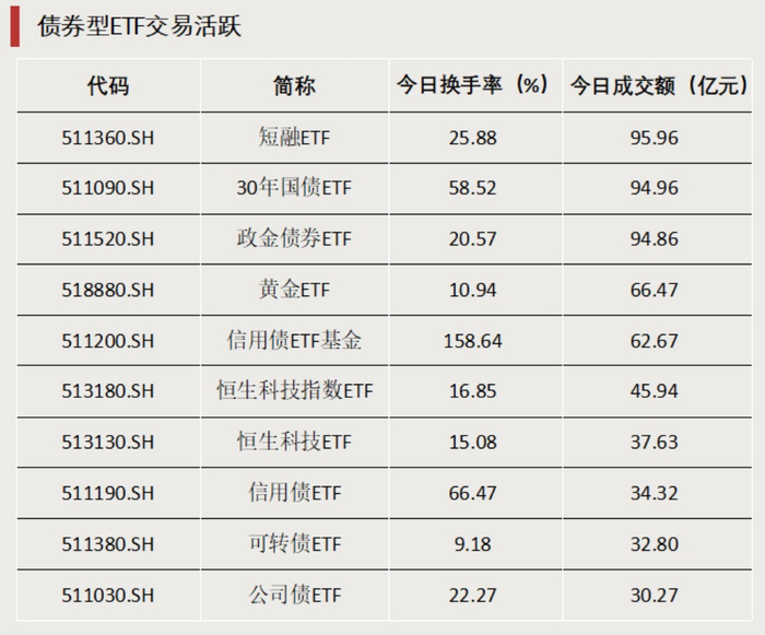 今日,短融ETF(511360)、30年国债ETF(511090)、政金债券ETF(511520)等债券型ETF交易显著活跃,成交额均较昨日增加超10亿元。