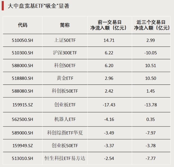 值得注意的是,资金更多涌向上证50ETF(510050)、沪深300ETF(510300)等大中盘宽基产品,两只ETF分别净流入14.71亿元、6.22亿元。此外,科创50ETF(588000)、科创板50ETF(588080)也吸引部分资金布局。