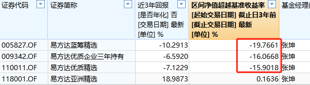 张坤管理的易方达蓝筹精选近三年亏9.93%,跑输业绩基准19%