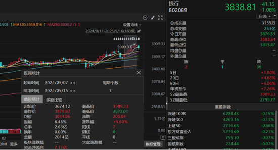 5月14日,大金融板块躁动。银行、保险、证券三大细分板块当天分别上涨了0.52%、6.04%和3.3%,尤其是银行指数在5月7日至15日出现7连阳,区间上涨5.6%,继续呈多头走势,吸引了不少股民的讨论。
