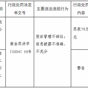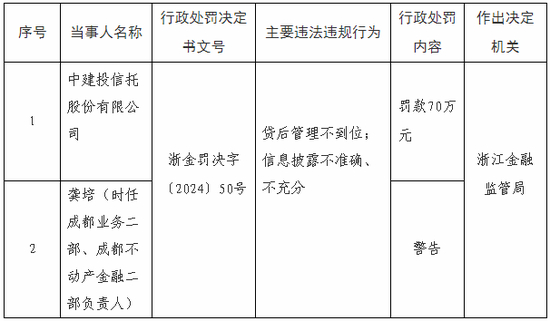 据国家金融监管总局对外披露,中建投信托因“贷后管理不到位,信息披露不准确、不充分”主要违法违规行为被浙江金融监管局处罚70万元。