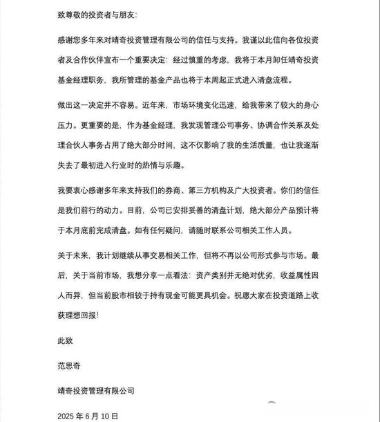 6月10日:靖奇投资官方公告范思奇向投资者发出卸任信,称因“市场环境压力及事务性工作负荷”,将于当月卸任基金经理职务,所管理产品启动清盘流程。信中表述将原因归结为“身心压力”及“失去行业热情”,未提及任何内部矛盾。