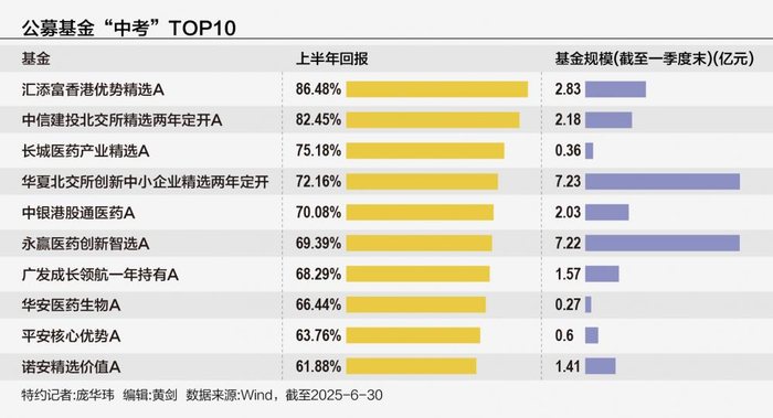 Wind数据显示,截至6月30日,汇添富香港优势精选A、中信建投北交所精选两年定开A、长城医药产业精选A跻身2025年上半年公募基金业绩前三名,1~6月涨幅分别达86.48%、82.45%、75.18%。