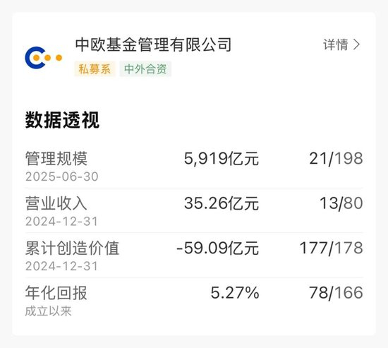 Wind数据显示,截至2025年6月30日,中欧基金的管理规模为5919亿元,行业排名21/198。2024年营业收入为35.26亿元,累计创造价值-59.09亿元,行业排名177/178,排名垫底。