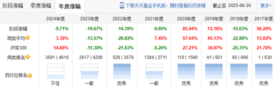 2021-2024年景顺长城新兴成长混合净利润分别为-63.94亿元、-74.83亿元、-72.35亿元、-26.84亿元,2025年上半年利润为-10.19亿元,四年半累计亏损248.14亿元。从产品业绩表现看,2024年至今亏幅收窄。