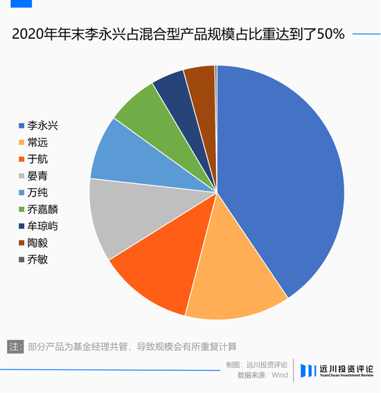 据Wind数据显示,2020年年末永赢旗下的13支混合型产品中,几乎90%以上产品的基金经理都是外部挖掘,其中仅李永兴一人就独占6席,规模占比达到了50%。