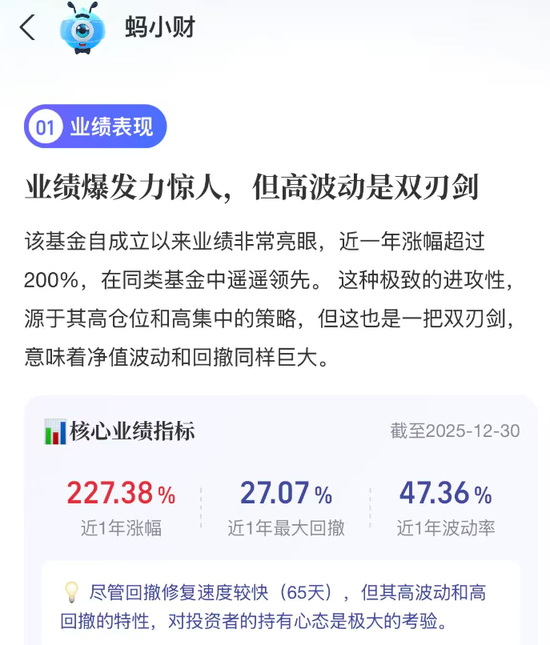 支付宝“蚂小财”认为,“永赢科技智选是一只高弹性、高风险的科技主题基金,业绩爆发力强,但波动巨大,这种极致的进攻性源于其高仓位和高集中的策略,但这也是一把双刃剑,意味着净值波动和回撤同样巨大。”