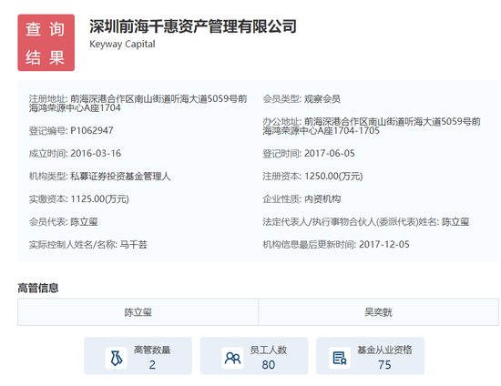 中国基金协会网站显示,千惠资本成立于2016年3月,并于2017年6月登记备案。公司注册资本1250万元,实缴比例90%。其规模常年保持在50~100亿。