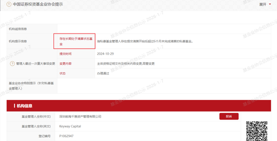 中基协网站显示,千惠资产存在长期处于清算状态的基金,目前共有122只产品处于提前清算状态,88只产品正在运作,1只延期清算,2只正常清算。