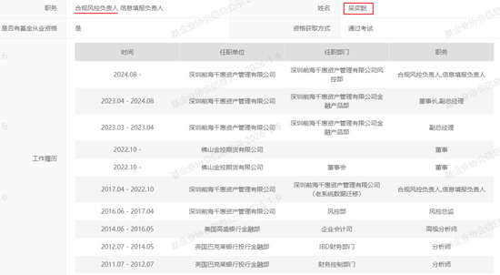 吴奕皝的履历相当亮眼。资料显示,吴奕皝拥有香港科技大学金融会计双学位,同时持有ACCA、CIMA、CFA。自2011年7月起,他任职于英国巴克莱银行投行金融部,先后担任财务控制部门和IBD财务部门的分析师,2014年6月至2016年5月,他任职于美国高盛银行金融部企业会计司,职位升级为高级分析师。2016年起,他加入千惠资产,担任风控负责人等职。