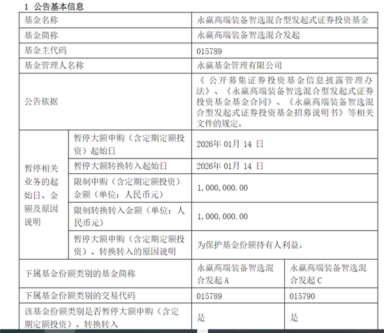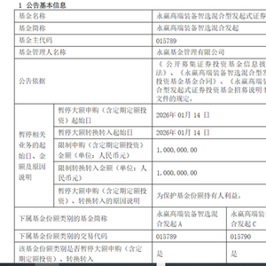1月13日,永赢基金公告称,为保护基金份额持有人利益,自2026年1月14日起,永赢高端装备智选混合发起将暂停个人投资者大额申购(含定期定额投资)、转换转入业务。限制申购(含定期定额投资)金额为100万元。