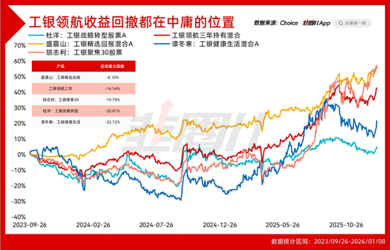 我也对比了杜洋、谭冬寒、盛震山、胡志利四个人单独管理的产品情况,四人合管的工银领航,无论收益回撤也处于中庸的位置上。