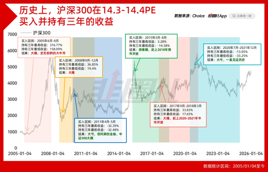 考虑到目前沪深300的估值是14.3左右,我回测了沪深300历史上市盈率在14.3-14.4之间,买入并持有三年的收益情况,大牛市大熊市,爆赚爆亏都经历过。