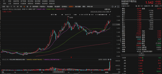 从易方达科创50ETF的走势看,在下图中的成交额柱状图中,可以看出,1月15日成交量开始放大,1月16日成交额则是显著放大。