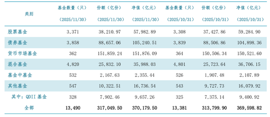 12月29日,基金业协会发布了截至2025年11月底的公募基金最新数据。在新的统计口径下,不管是股票型、债券型、货币基金,还是混合型、FOF和其他类型产品,份额全都增长——整个公募基金的总规模已经冲到37.02万亿元,又创了历史新高。